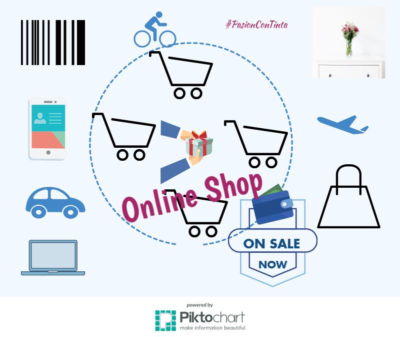 Imatge reada amb *Piktochart* que mostra una composició visual titulada *Online Shop*, amb icones relacionades amb l’experiència de compra digital: carros, bosses, mòbil, avió, regals i etiqueta *ON SALE NOW*.
