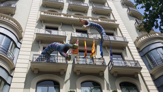 Composició fotogràfica amb un edifici d’estil clàssic decorat amb figures de dinosaures que emergeixen per les finestres. El contrast entre arquitectura urbana i imaginari prehistòric genera una escena visualment impactant.