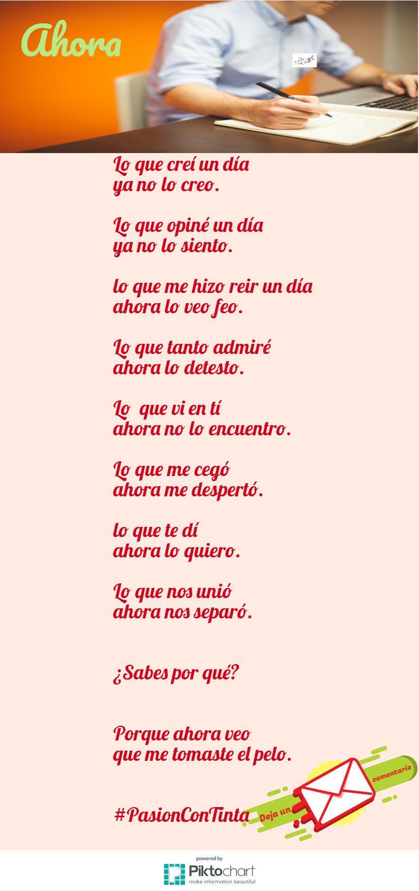 Escena gràfica amb un poema titulat “Ahora”, presentat sobre un fons decoratiu amb tipografia estilitzada. El text expressa una reflexió melancòlica sobre l’absència, el pas del temps i el desgast emocional, amb repeticions que intensifiquen el to íntim i resignat.