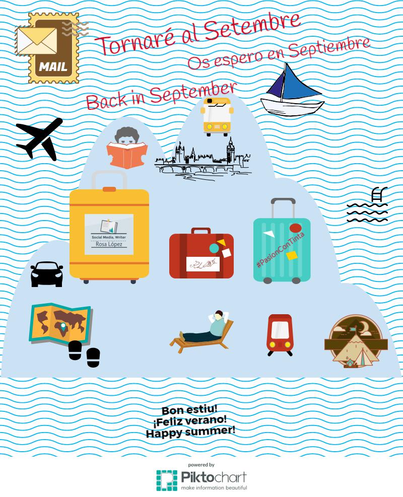 Infografia que combina motius de vacances d’estiu —com la platja, l’avió i la maleta— amb elements que anuncien la tornada a l’escola, com el calendari, el globus terraqüi i l’autobús escolar. El fons amb línies ondulades evoca l’aigua i el moviment