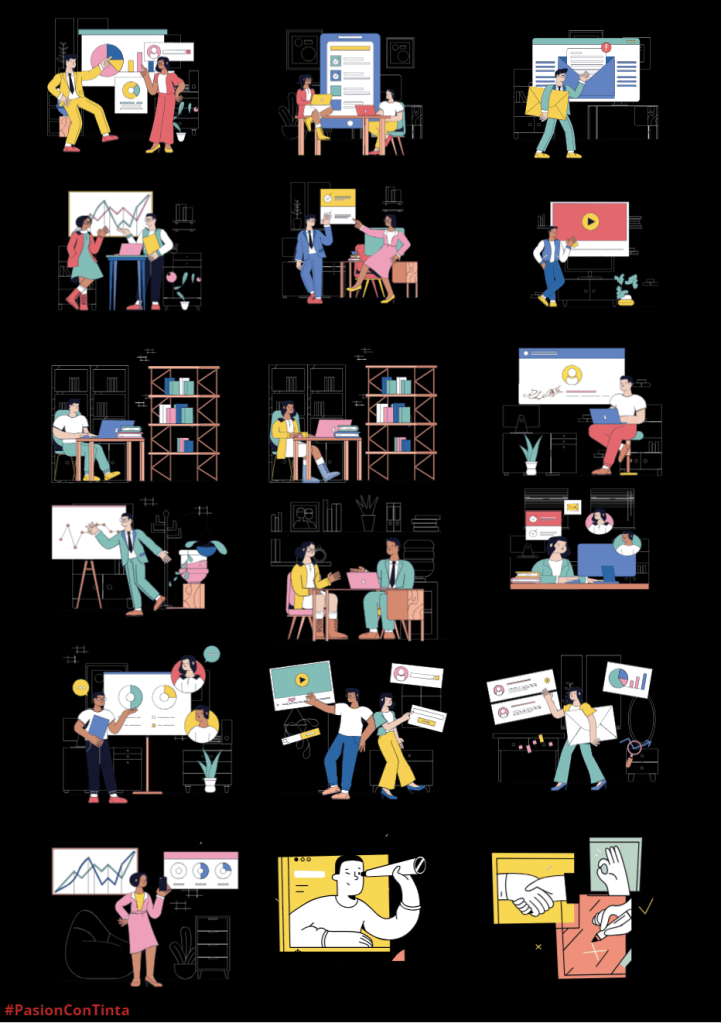 Les escenes representen la presentació de resultats de campanyes de màrqueting, brainstorming d’estratègies o informes mensuals.