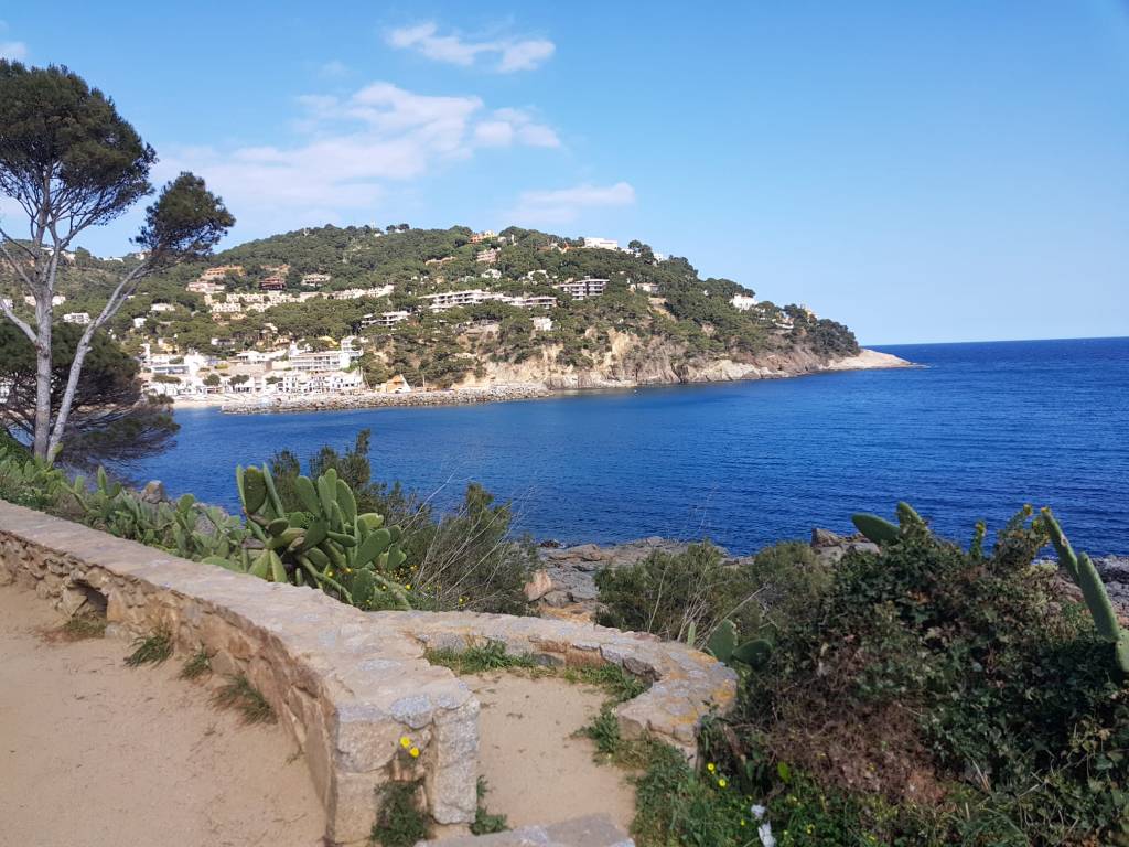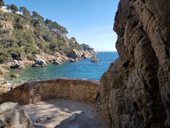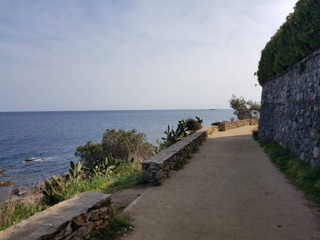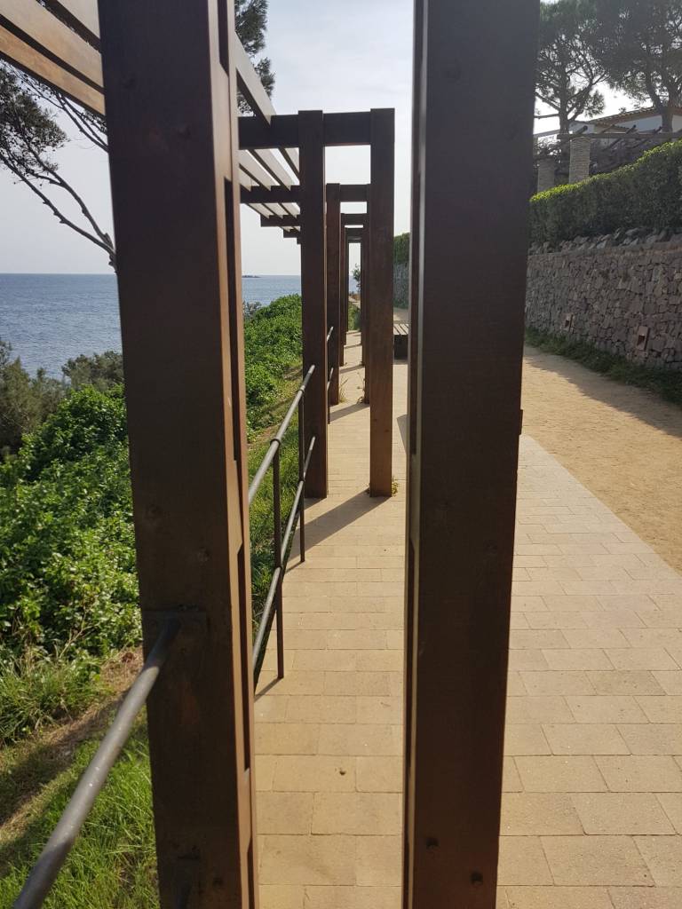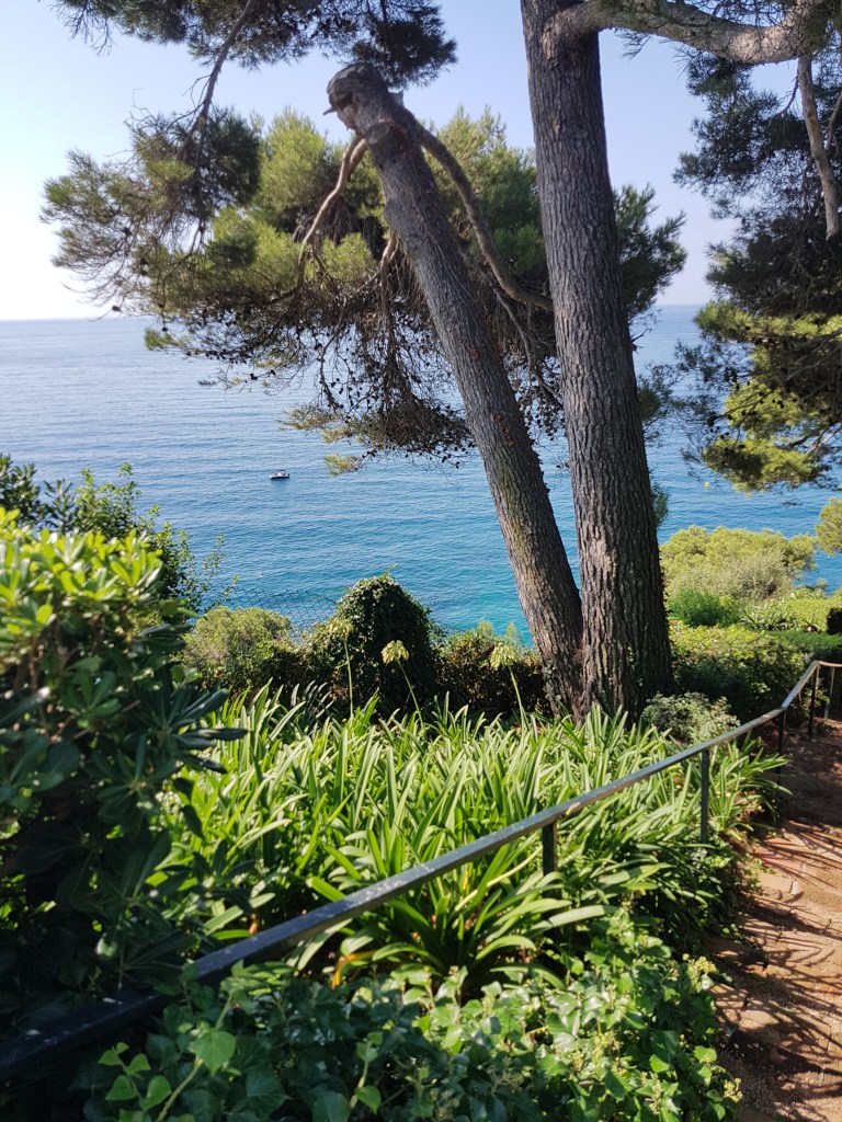 Vista des d’un camí rocallós amb barana, amb el mar blau i embarcacions al fons