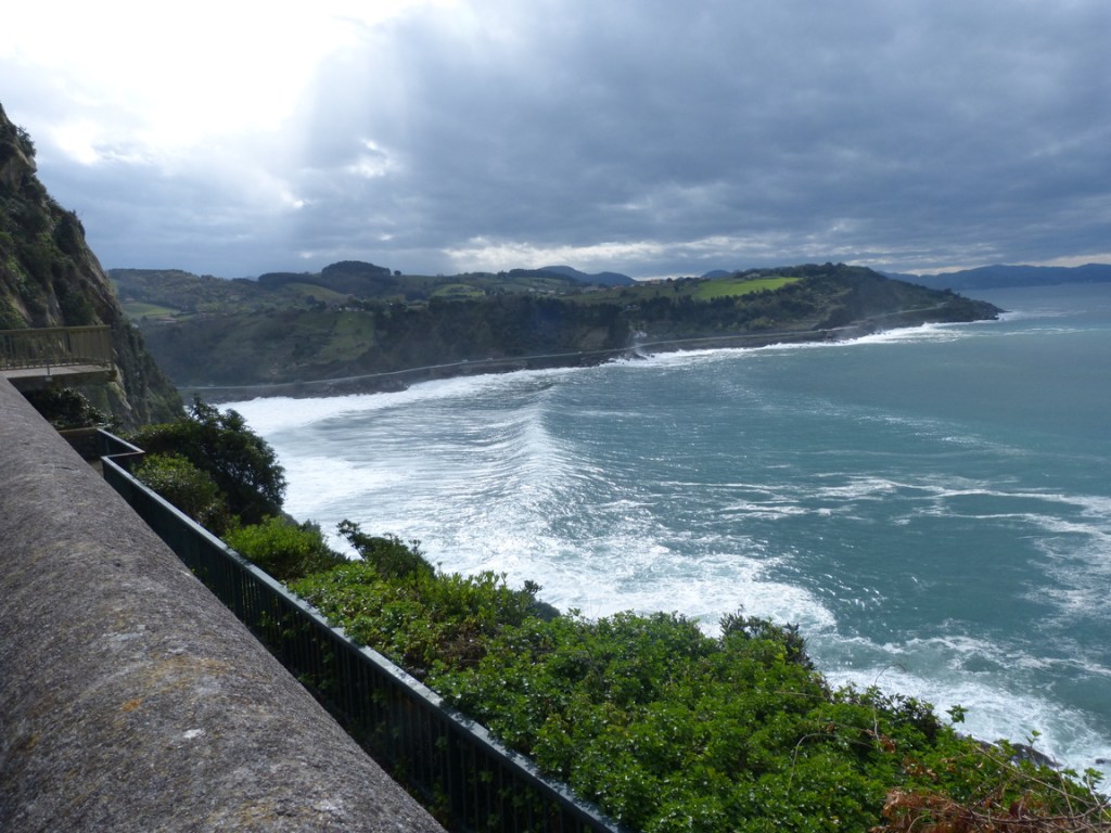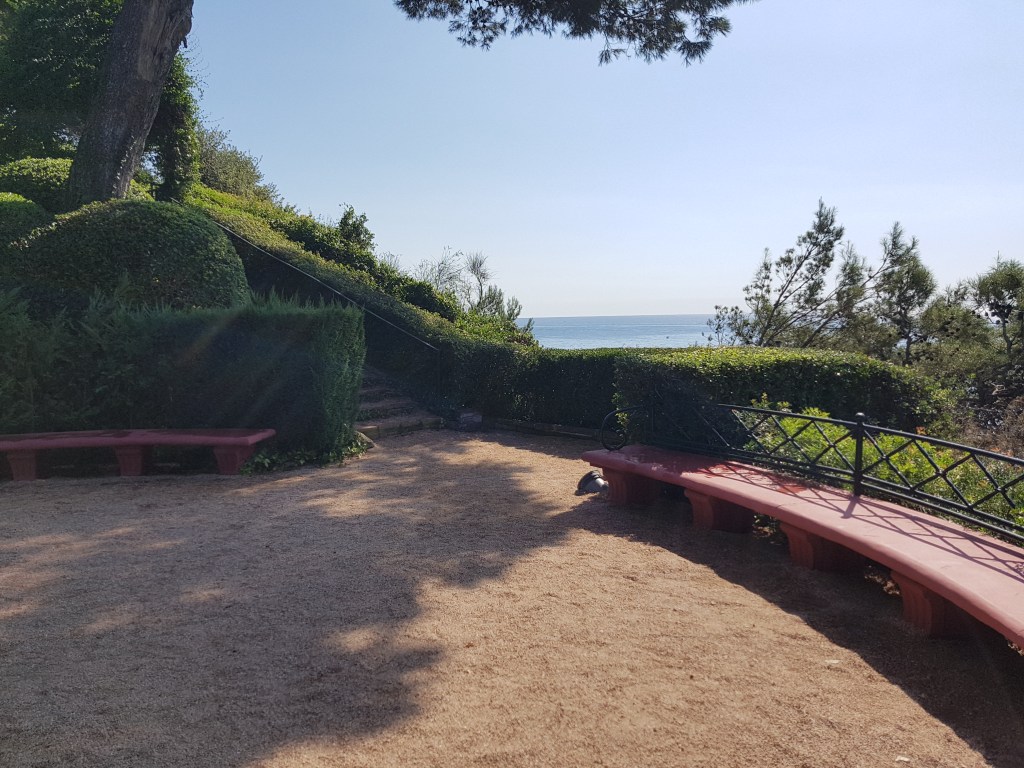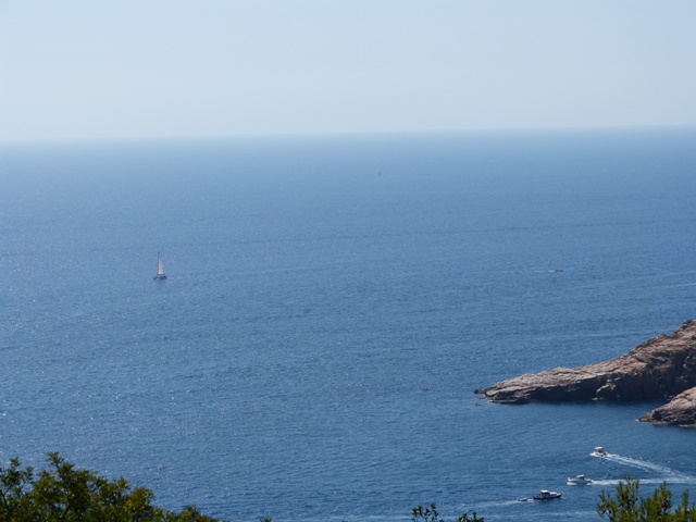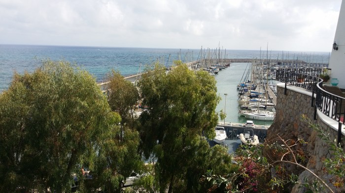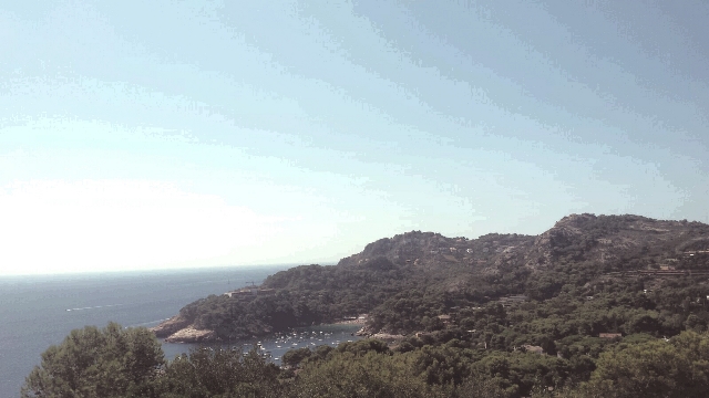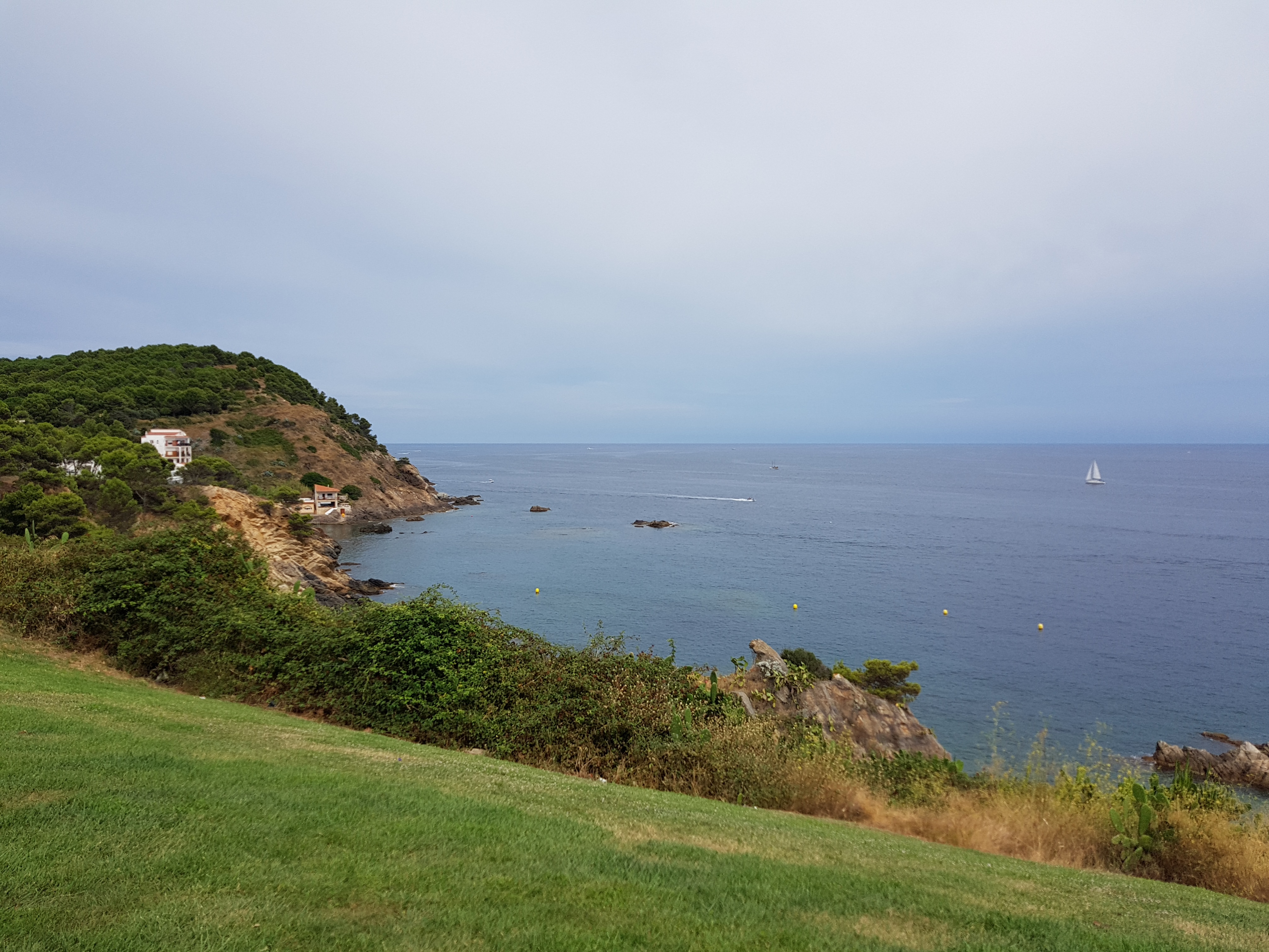 Vista des d’un camí rocallós amb barana, amb el mar blau i embarcacions al fons
