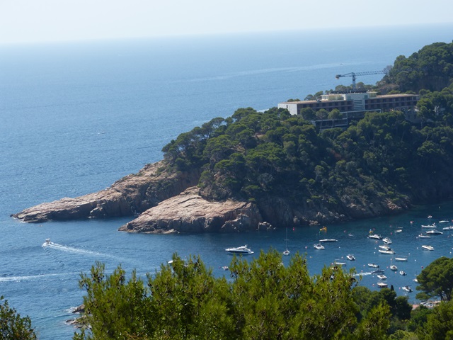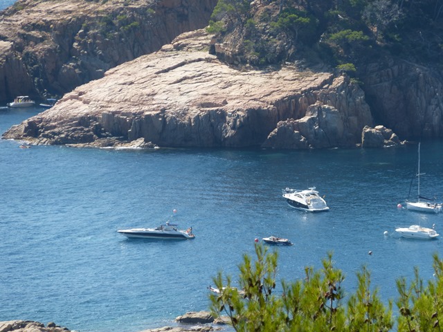Vista elevada d’una badia amb barques fondejades, penya-segats i vegetació mediterrània