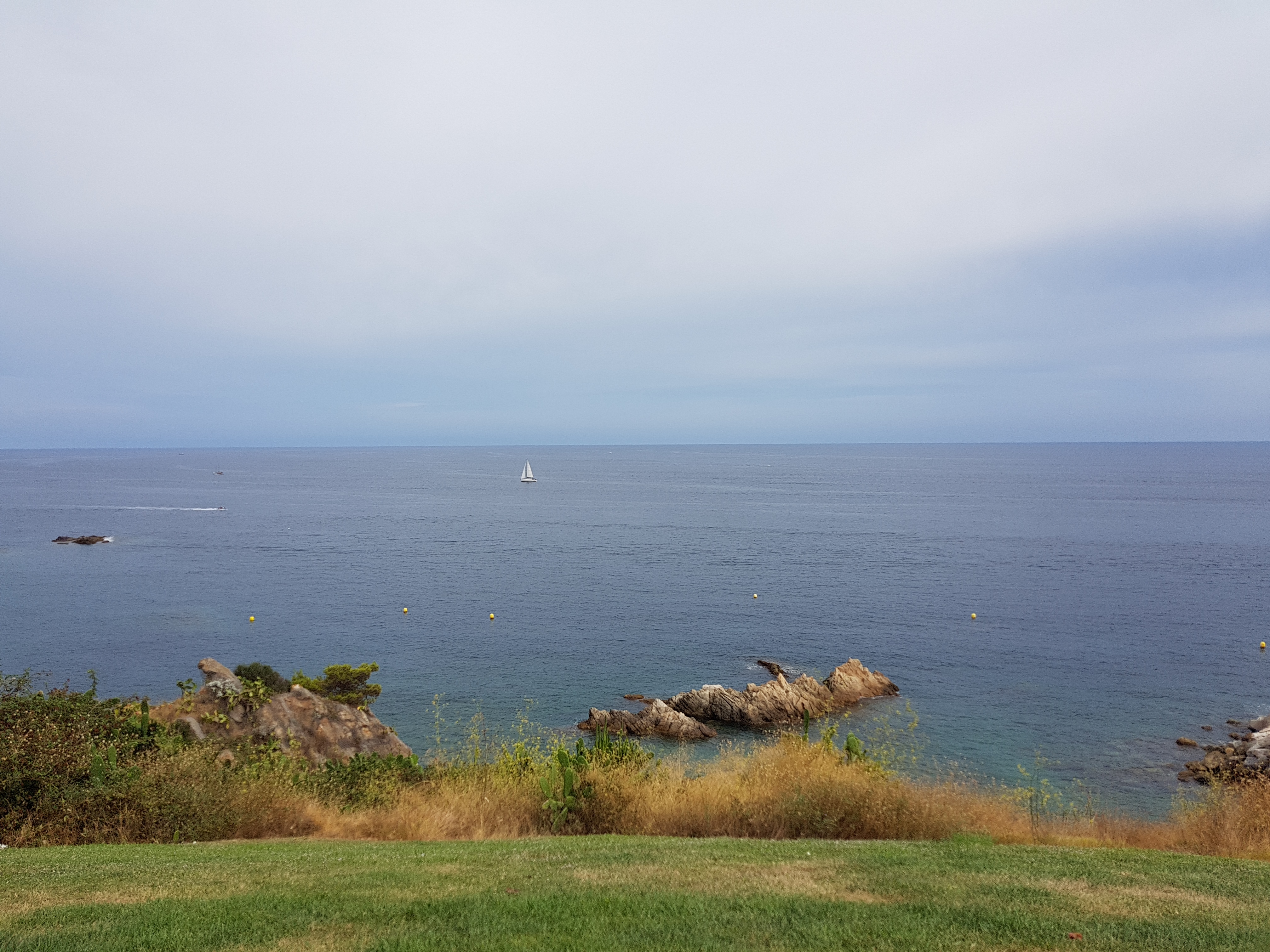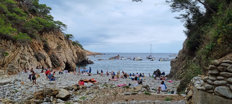 Vista d’una caleta amb banyistes, penya-segats rocosos i velers al fons