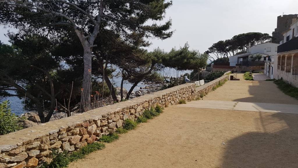 Torre de pedra medieval sobre penya-segat amb vistes al mar, amb camí i barana