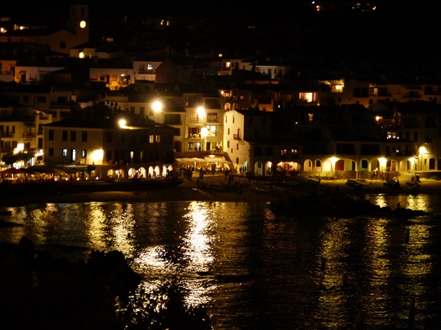 Fotografia captada a Calella de Palafrugell, mostrant el nucli costaner de nit amb llums càlides que es reflecteixen sobre les aigües tranquil·les. Les cases mediterrànies s’agrupen al llarg de la costa, creant una composició íntima i serena.