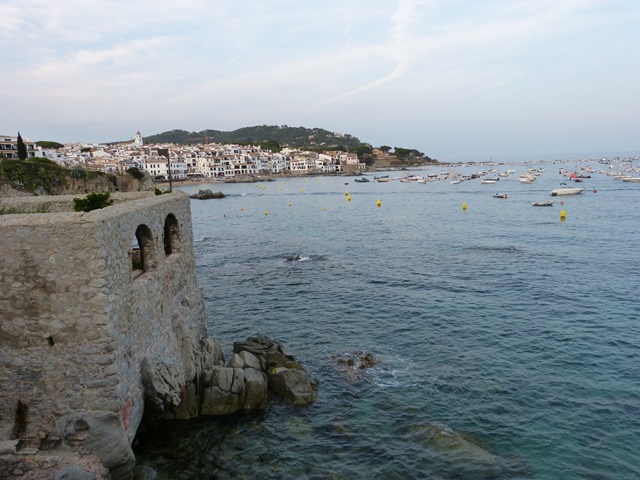 Imatge de la costa de Calella, Catalunya, amb barques al mar, edificis al fons i un mirador de pedra. Capturada des de Rubí per il·lustrar paisatges marítims catalans.