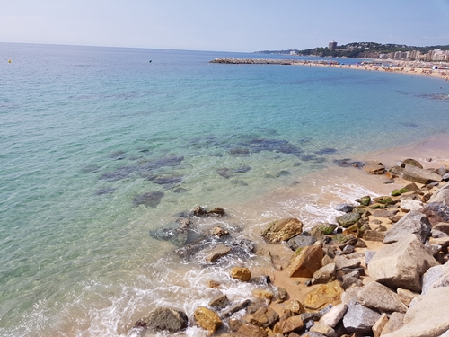 Fotografia horitzontal que mostra una escena costanera des d’un punt elevat: roques al primer pla, mar clar i edificis al fons. Publicada el 3 de setembre de 2018 per Rosa López dins el projecte PasiónConTinta, evoca perspectiva, distància i la relació entre natura i urbanisme a la Costa Brava.