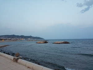 Fotografia horitzontal que mostra la costa de Sitges a mitja tarda: mar en calma, roques al primer pla i edificis al fons sota un cel gris. Publicada el 26 d’agost de 2018 per Rosa López dins el projecte PasiónConTinta, evoca quietud, transició i la bellesa subtil dels instants que no criden però perduren.