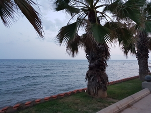 Fotografia horitzontal que mostra un tram del passeig marítim de Sitges amb palmeres, vorera i el mar al fons. Publicada el 26 d’agost de 2019 per Rosa López dins el projecte PasiónConTinta, evoca estiu, calma urbana i la bellesa quotidiana de la costa catalana.